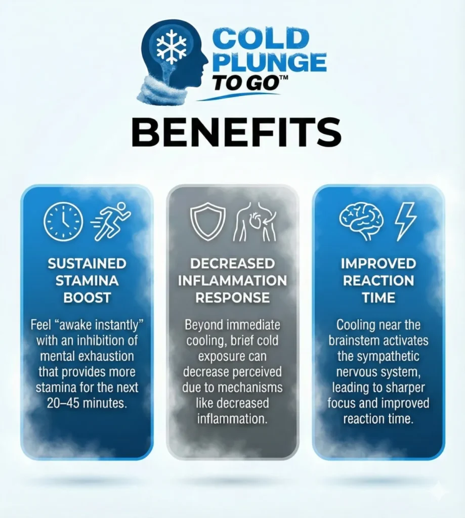 Cold Plunge To Go brings the recovery of the ice bath directly to the source of the heat. By targeting the brainstem with cold exposure, you effectively hack your body’s thermostat. This activates the sympathetic nervous system to increase alertness and inhibits the buildup of mental exhaustion, giving you that “awake instantly” feeling—even in the middle of a heatwave.